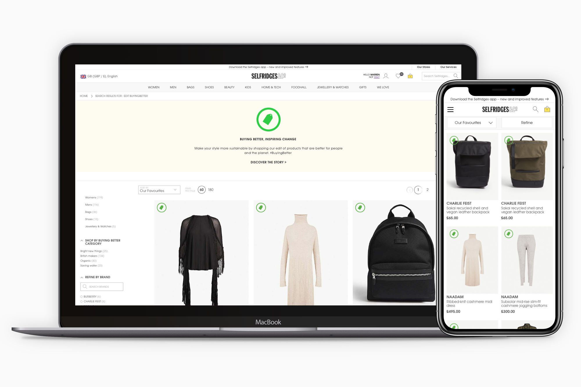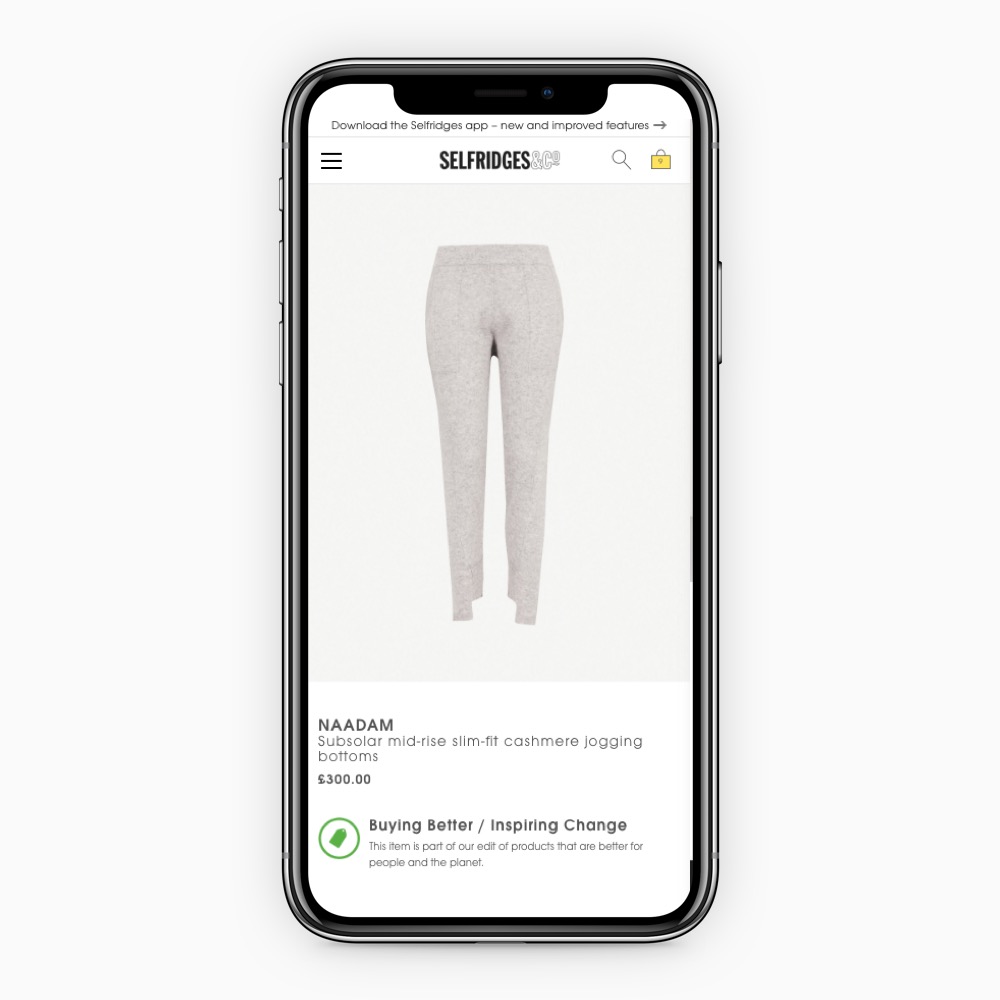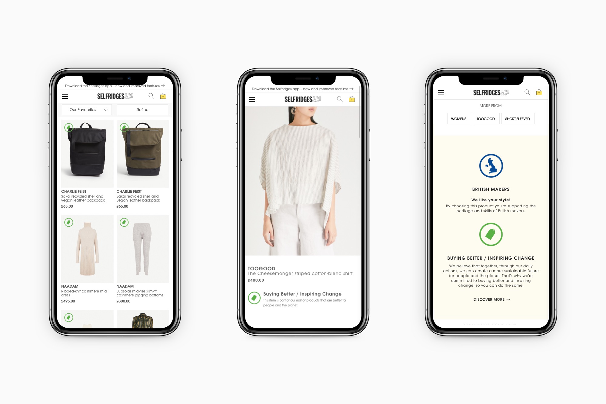 We used labelling to call out the different areas in which Selfridges was being sustainable, and used information franchising to give each icon a purpose so that we could then talk more about this on the product description pages.