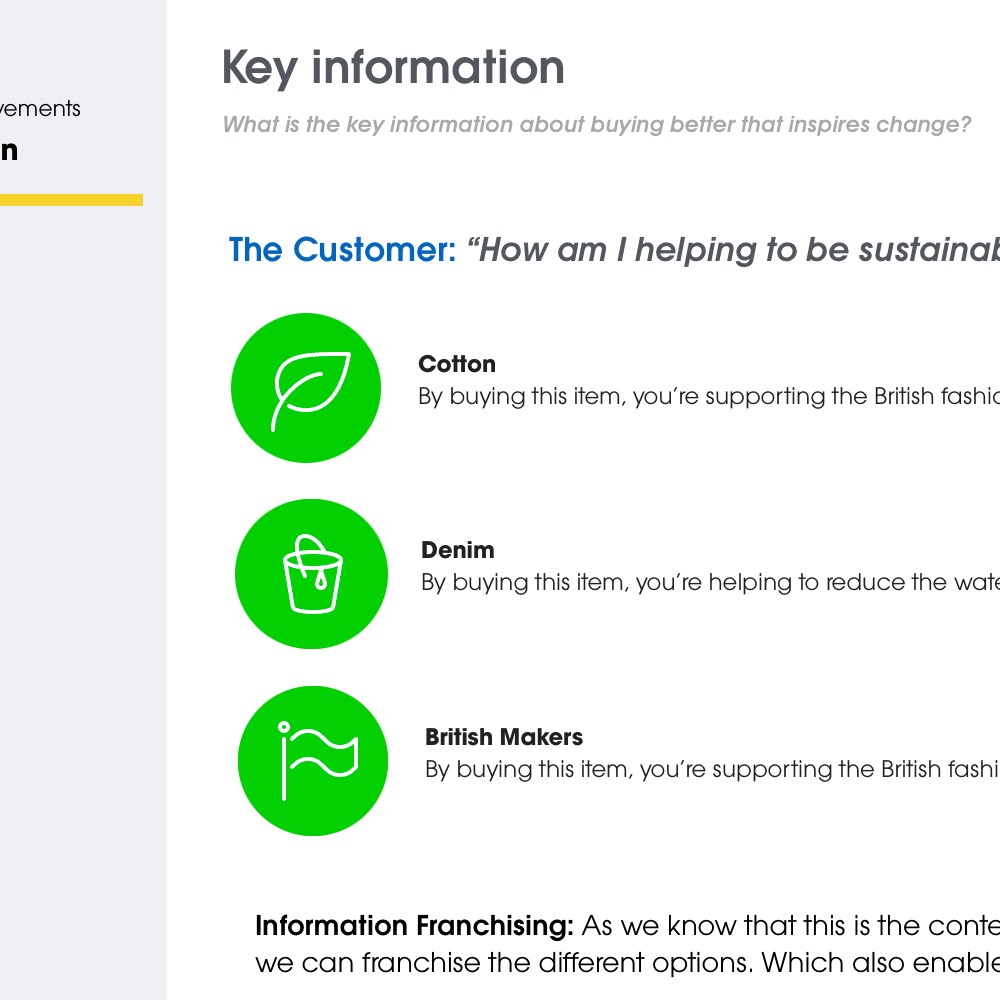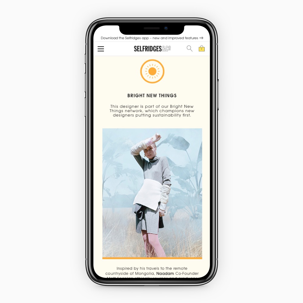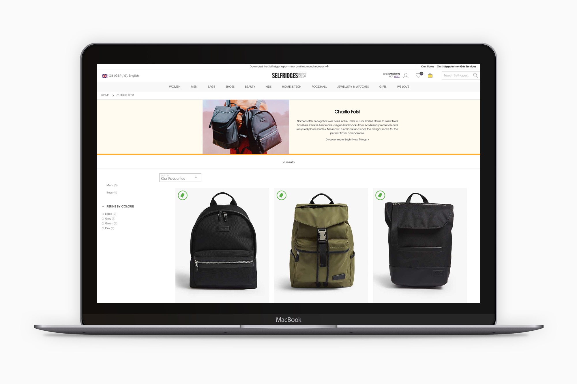 We used labelling to call out the different areas in which Selfridges was being sustainable, and used information franchising to give each icon a purpose so that we could then talk more about this on the product description pages.